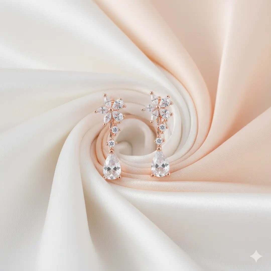 Radiate timeless romance with these exquisite drop earrings, masterfully crafted from premium 925 sterling silver and finished in a warm, luxurious rose gold. The design features a delicate five-petal flower stud that cascades into a shimmering line of accents, culminating in a brilliant pear-cut zirconia stone that captures the light with every turn