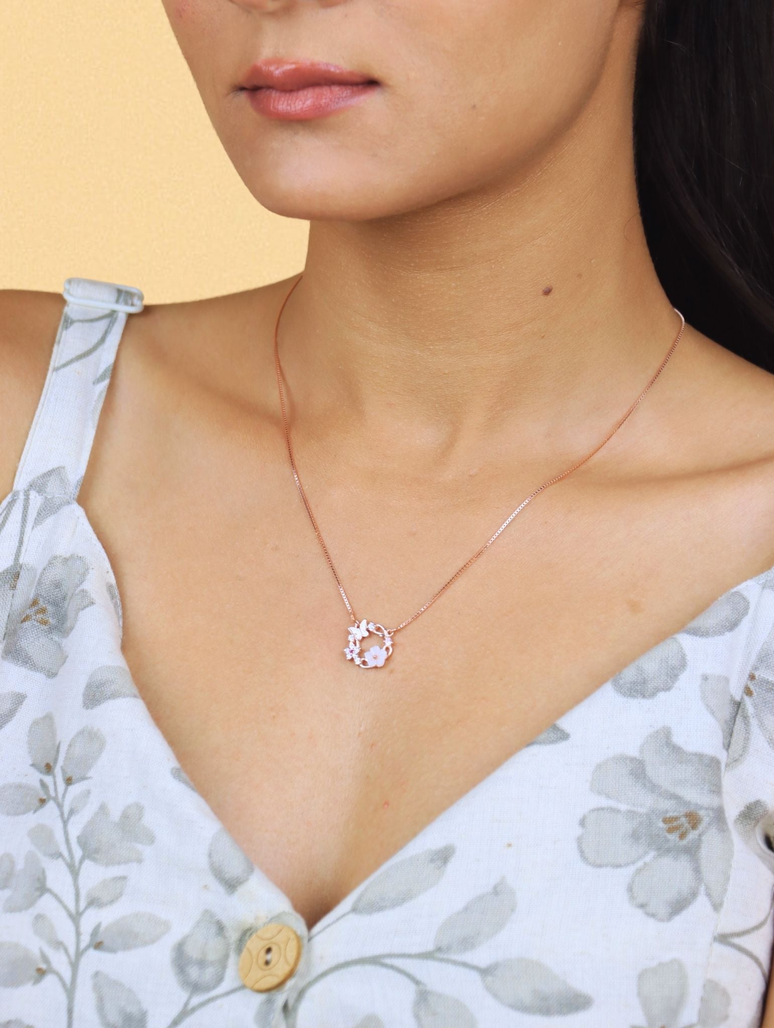 Celebrate spring year-round with the Blossom Circle Rose Gold Pendant – a charming wreath-shaped design adorned with rose gold butterflies, pastel enamel flowers, and sparkling cubic zirconia. At its heart lies a soft pink flower with a golden stamen, blending whimsy with elegance. Perfect for Spring events, nature lovers, bridesmaids, or anyone drawn to a soft, romantic style.