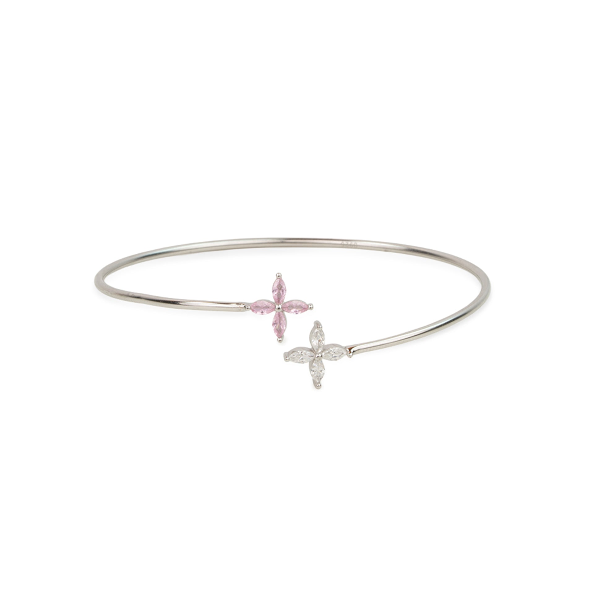 This open bangle features twin floral motifs, one adorned with soft pink zircon petals and the other with clear cubic zirconia, symbolizing grace and harmony. 💎