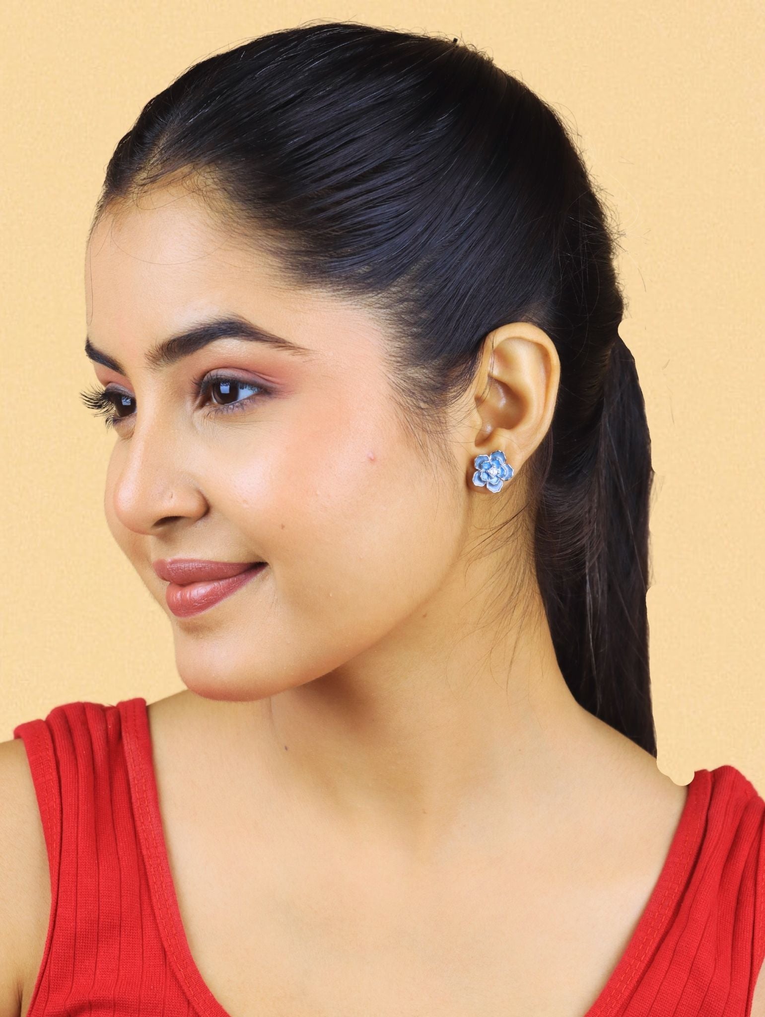 The elegance and charm to your look with our Blue Blossom Enamel Stud Earrings. Expertly crafted in a delicate floral design, these earrings feature layers of soft blue and turquoise enamel petals edged in silver-tone metal for a stunning contrast. A sparkling central crystal adds a hint of shimmer, making them perfect for both casual and formal occasions. Lightweight and comfortable, these studs are a timeless accessory that brings beauty and sophistication to any outfit.
