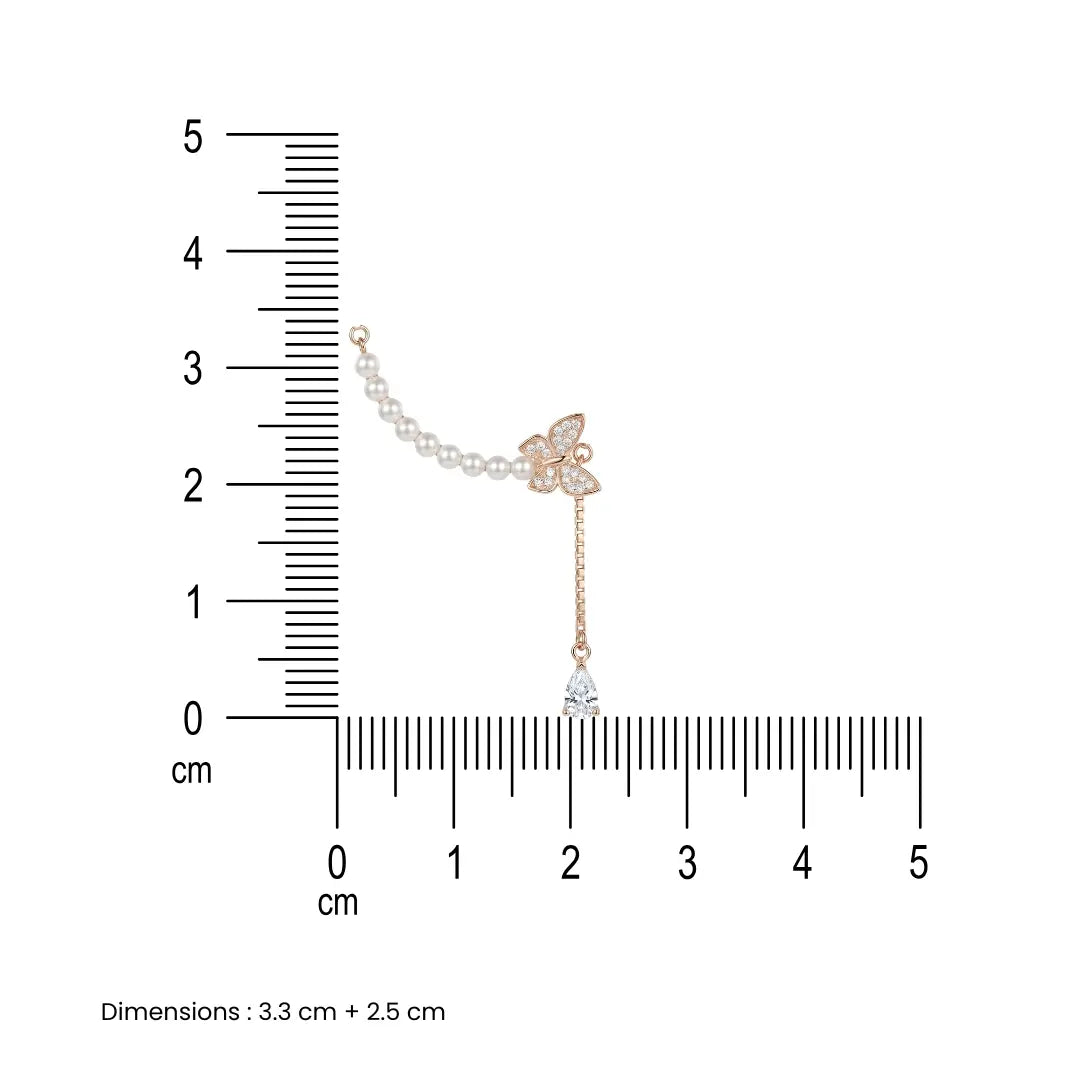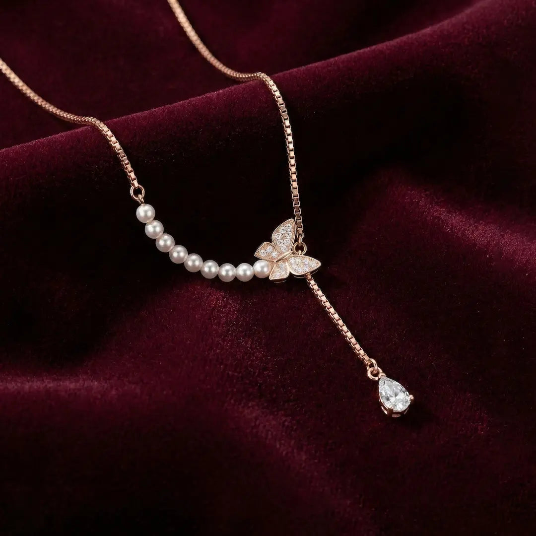 Delicate and feminine, the Butterfly Grace Necklace is crafted in 925 sterling silver with a warm rose gold finish. Featuring a graceful arc of lustrous pearls, a sparkling butterfly motif, and a pear-cut drop stone, this adjustable necklace adds effortless elegance to both everyday and occasion wear.
