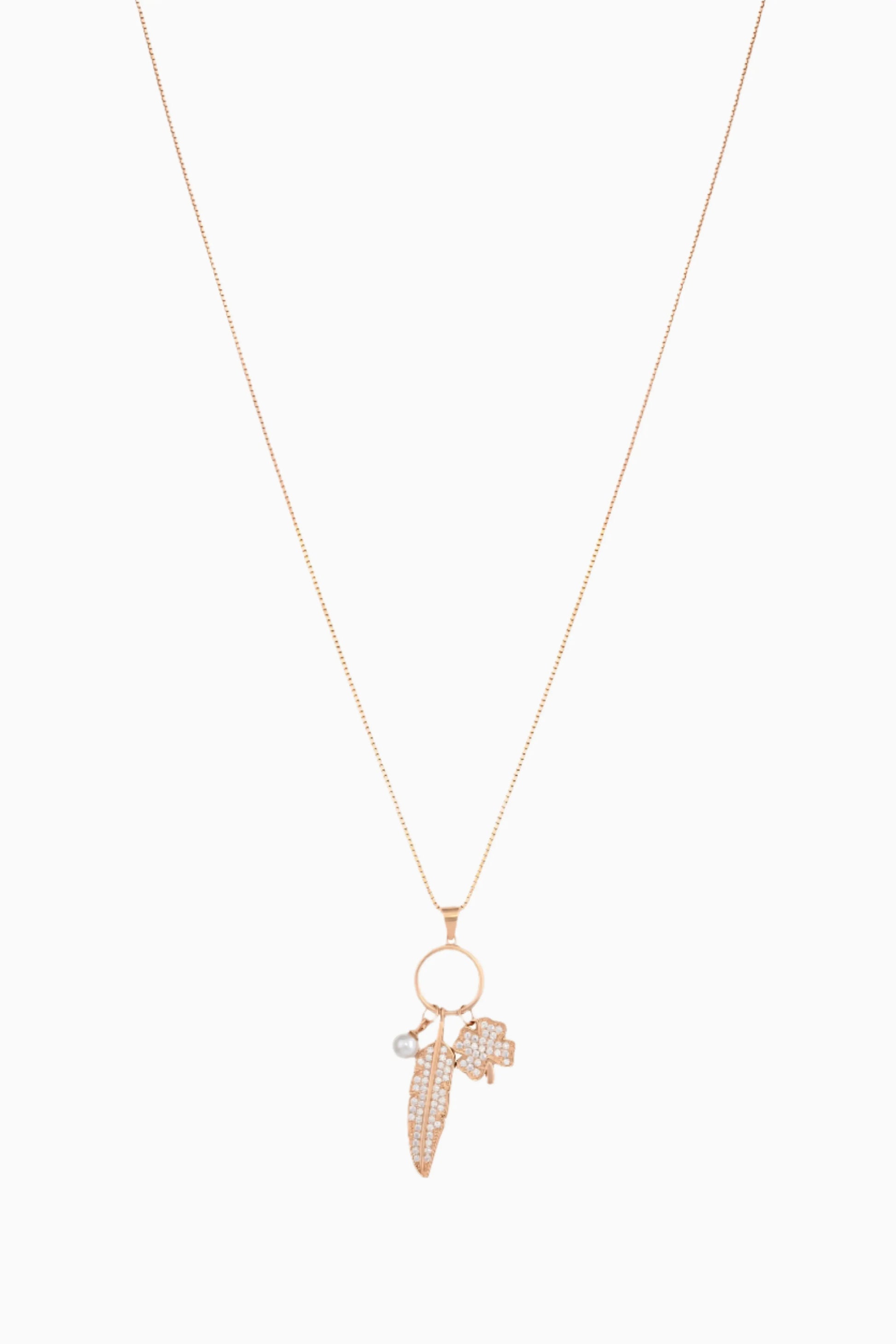 A graceful feather-shaped charm hangs below, adding a whimsical touch.