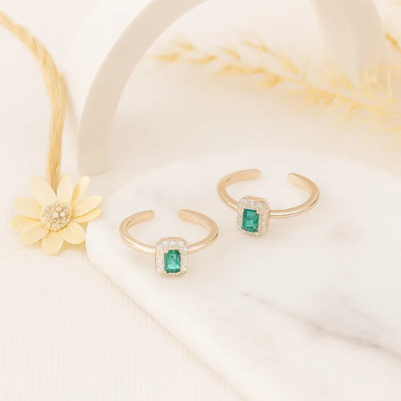These rose gold silver toe rings feature a stunning emerald-cut green stone framed with a sparkling halo.