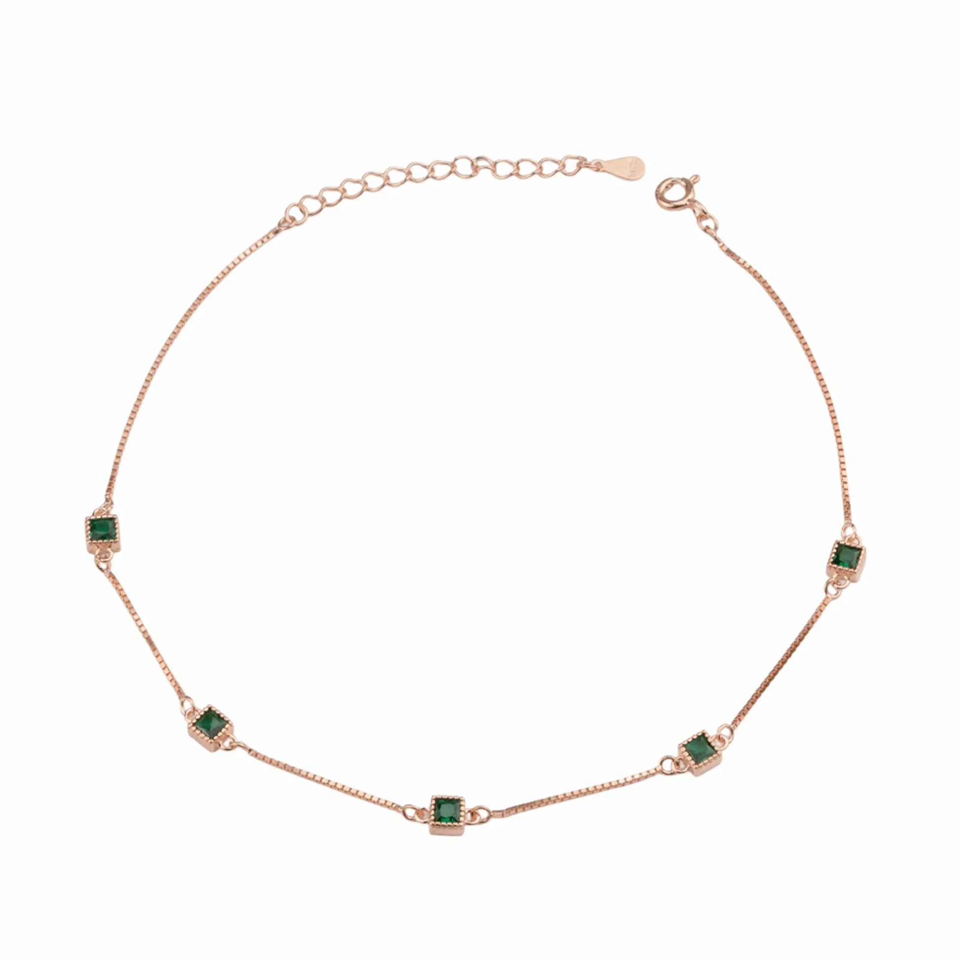 Add a touch of timeless grace with our Emerald Whisper Silver Anklet, beautifully crafted in rose gold-plated 925 sterling silver. Each anklet features dainty emerald-green cubic stones set along a fine chain, blending luxury with minimal charm. Designed to rest delicately on your ankle, this silver anklet embodies sophistication and daily elegance. Perfect for women who love minimalist silver jewellery with a hint of royal glamour.