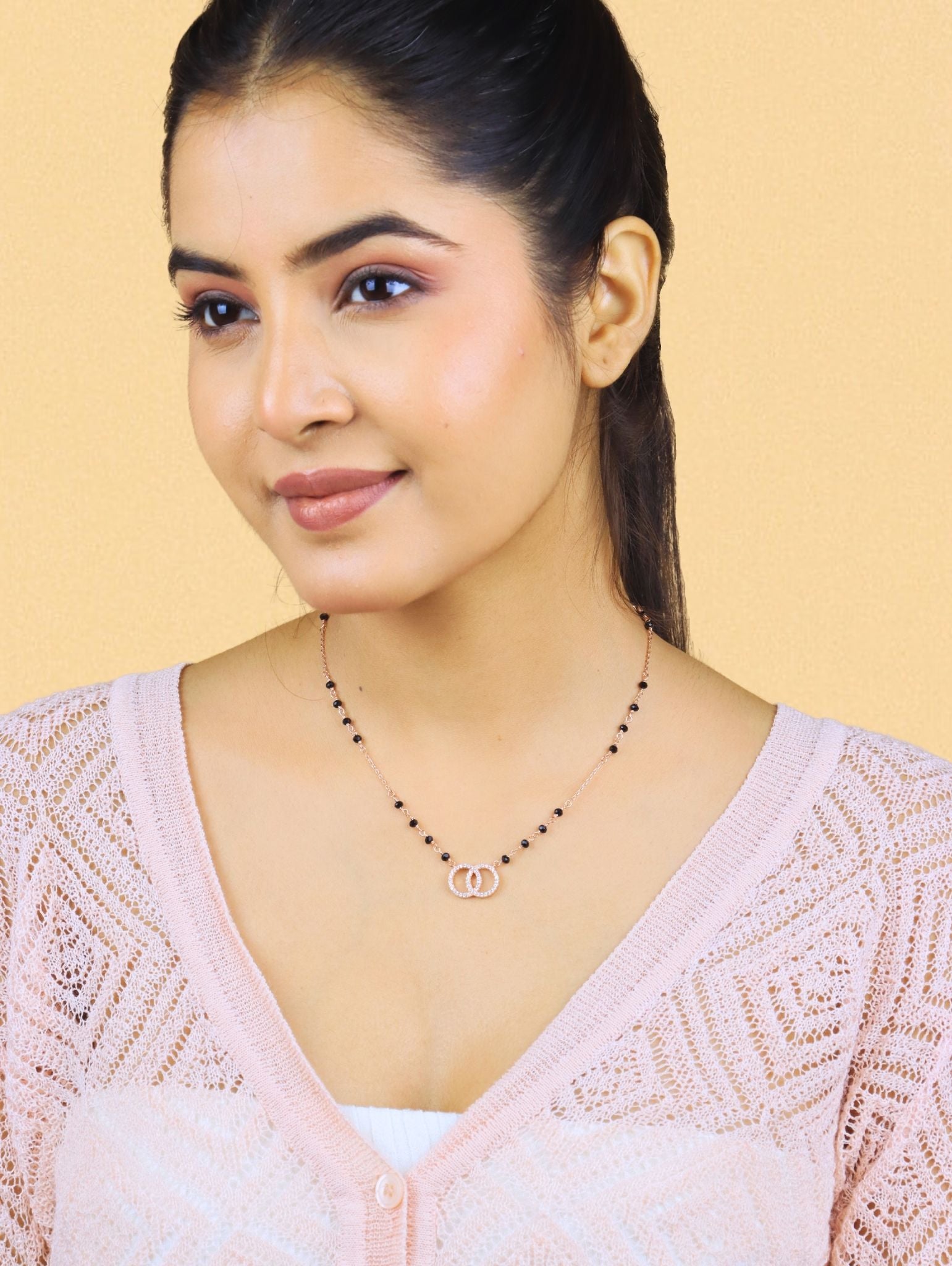 Celebrate the beauty of togetherness with the Eternal Bond Mangalsutra. This exquisite piece features two interlocking rose gold circles, each encrusted with sparkling white stones, symbolizing unity, infinity, and unbreakable love. The elegant black beads along the delicate chain pay homage to tradition, while the contemporary design brings a modern glow to every look. Ideal for brides, anniversaries, or daily wear, this necklace is a timeless emblem of a love that lasts forever.