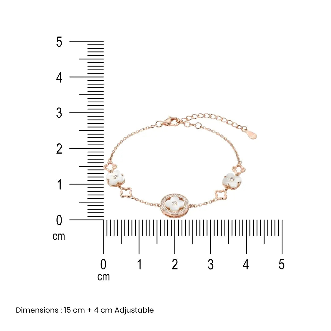 This exquisite Floral Radiance Bracelet is a testament to modern elegance. Crafted from high-quality silver and finished with luxurious rose gold plating, the bracelet exudes a sophisticated charm. The bracelet features a delicate chain adorned with a series of interconnected flower motifs. Each flower is meticulously crafted, with sparkling white stones adding a touch of brilliance. A central, larger flower motif, highlighted by a circle of shimmering stones, takes center stage.