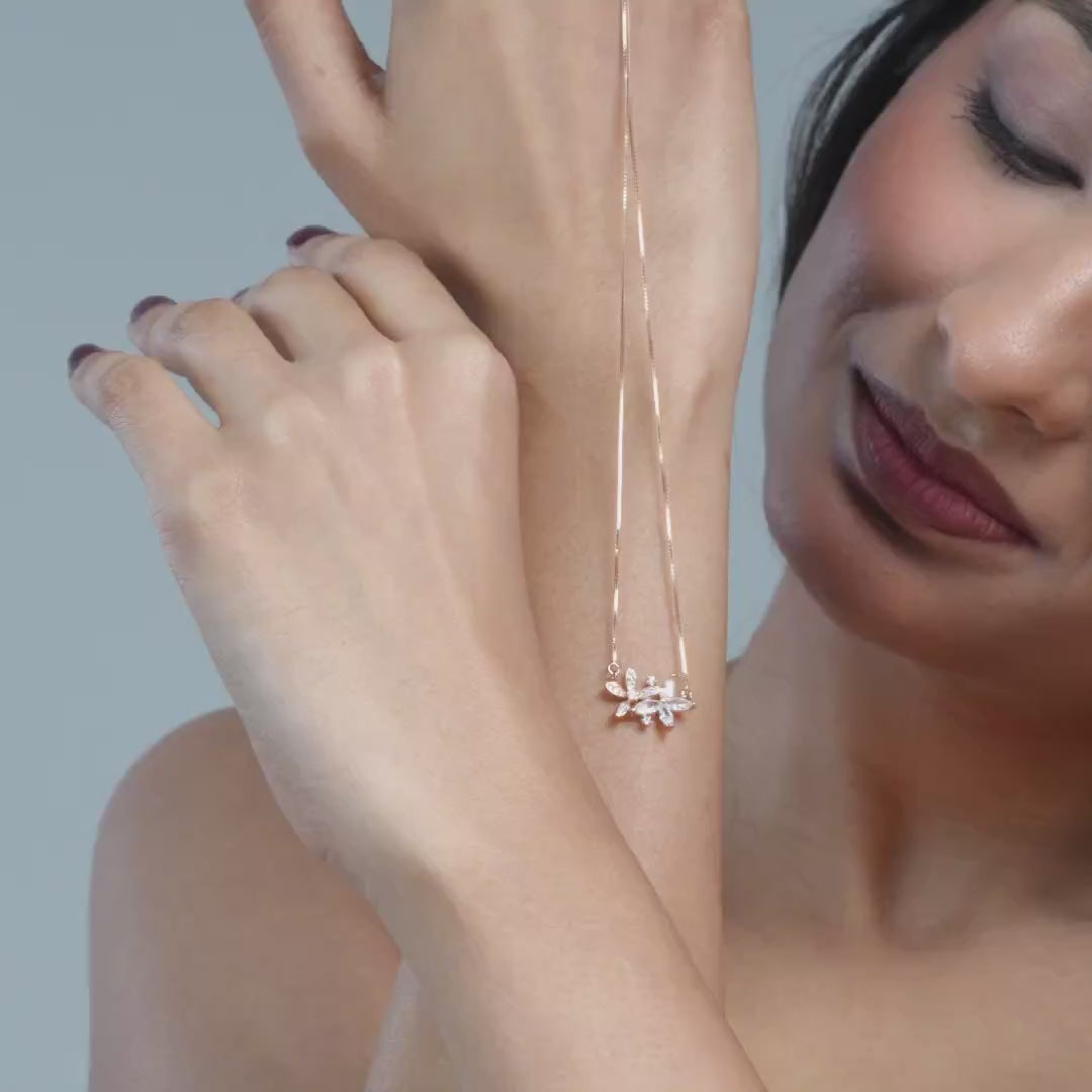 The Floral Spark Necklace is crafted in 925 sterling silver with a luxurious rose gold finish. Featuring a radiant floral cluster of marquise and round cubic zirconia stones, this adjustable necklace offers timeless elegance with a modern sparkle—perfect for everyday sophistication or special occasions.