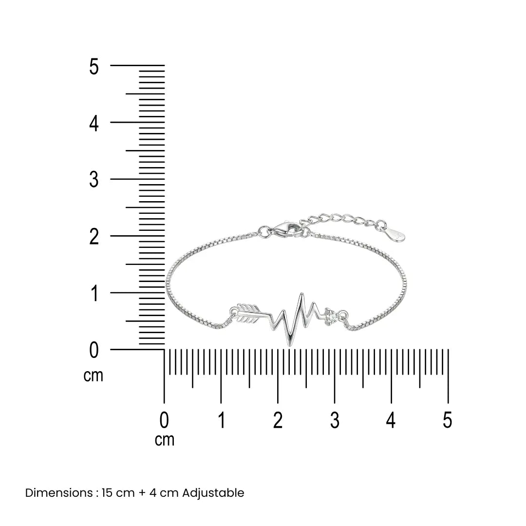 This exquisite Heart's Echo Bracelet is a captivating blend of elegance and symbolism. Crafted from high-quality silver and finished with a luxurious rhodium plating, the bracelet exudes a sophisticated charm. The bracelet features a delicate chain adorned with a central heart-shaped motif, intricately designed to resemble an electrocardiogram (ECG) pattern, a symbol of love and life.