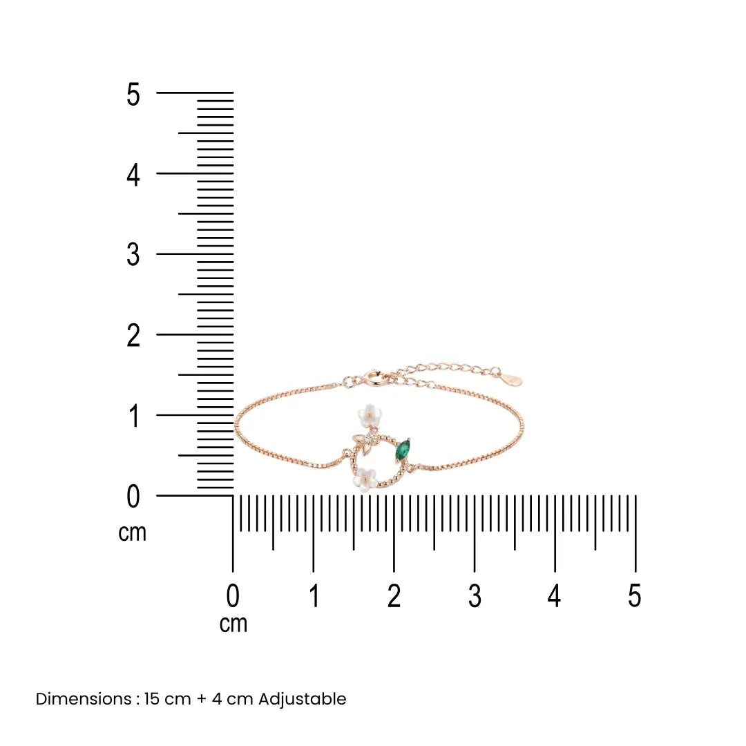 This exquisite Round Bracelet is a testament to modern elegance. Crafted from high-quality silver and finished with a luxurious rose gold plating, the bracelet exudes a sophisticated charm. The bracelet features a delicate chain adorned with a captivating round pendant, intricately designed with a floral motif, featuring a butterfly, leaves, and flowers. The pendant is adorned with sparkling white stones, adding a touch of brilliance.