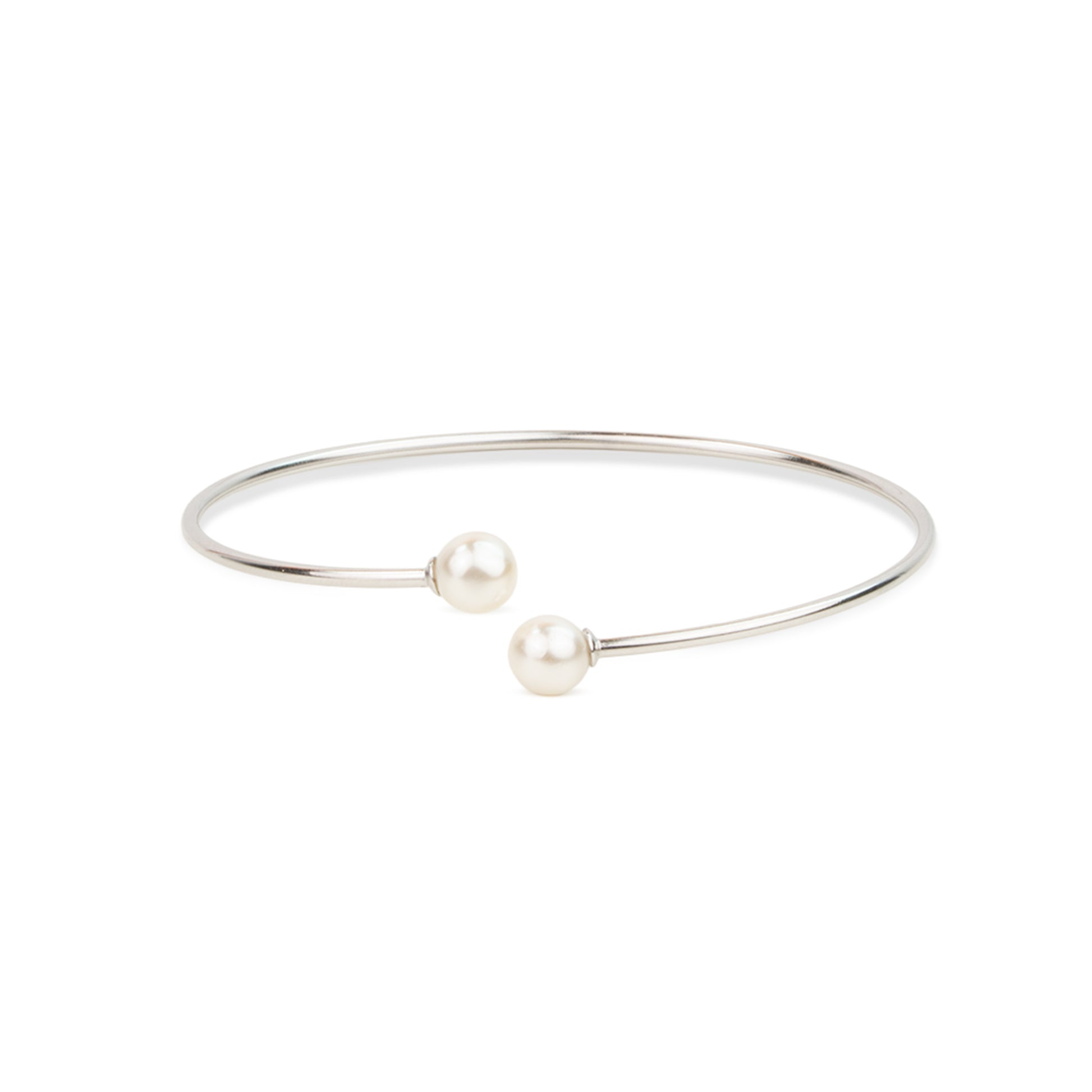 Size: Adjustable | Diameter: 6.5 cm | Colour: Silver with White Pearls | Pattern: Minimal open bangle with dual pearl caps.