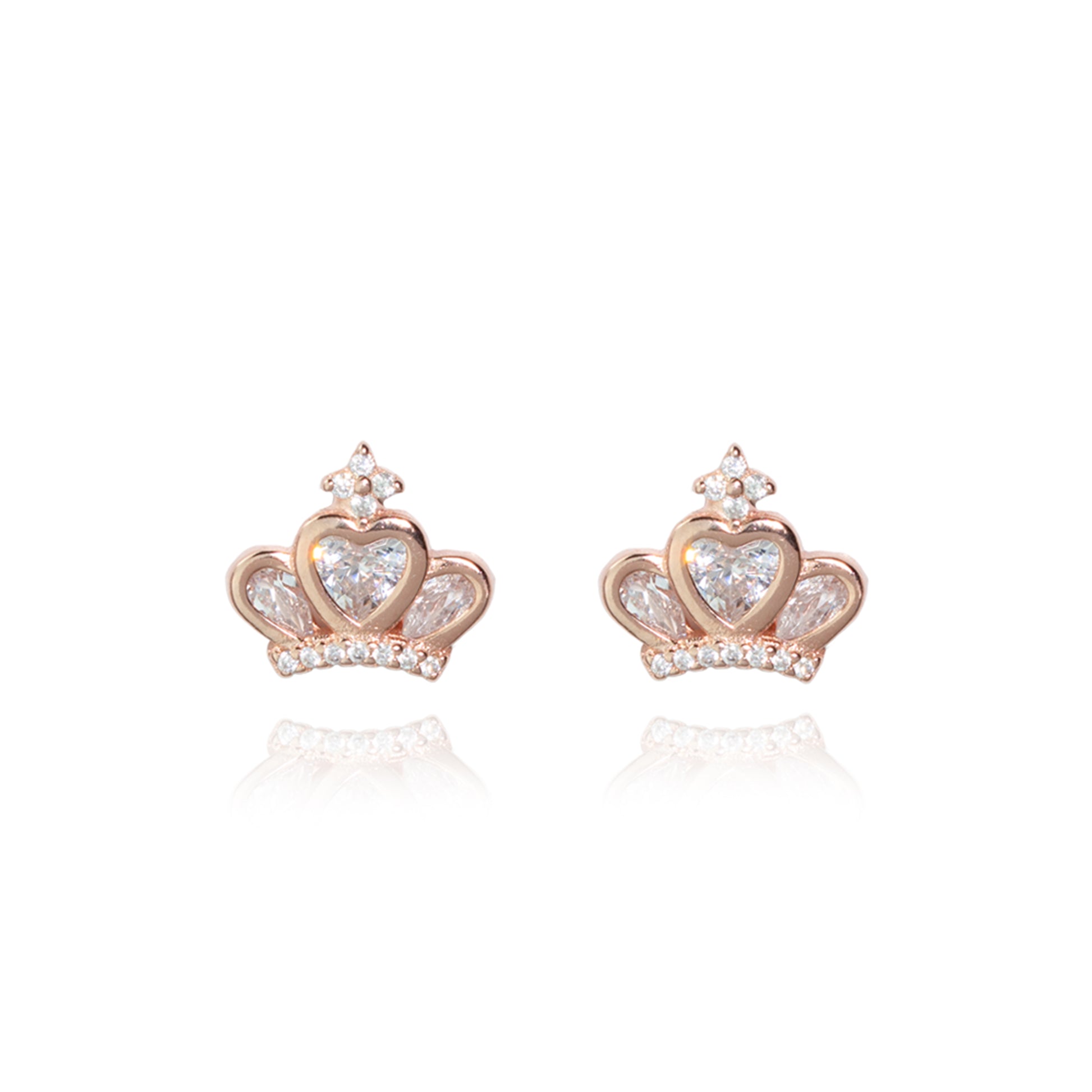 Size: 1.4 cm (H) × 1.2 cm (W) | Colour: Rose Gold with Clear White Zirconia | Pattern: Royal crown motif with heart centerpiece.