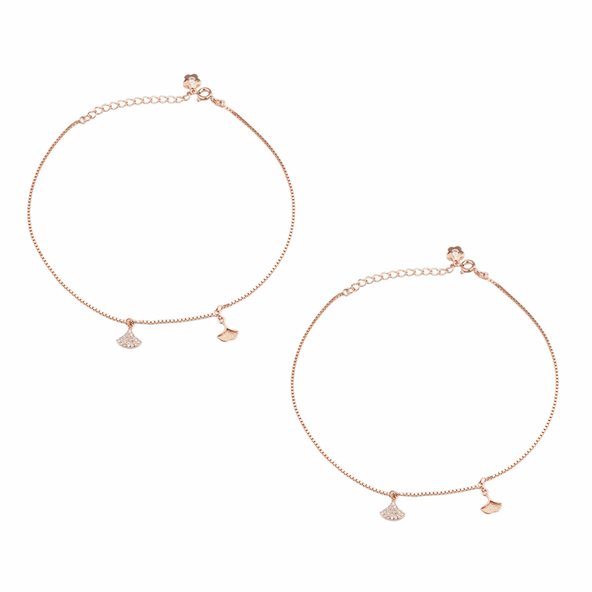 Crafted in high-quality 925 sterling silver with a soft rose-gold hue, it features two petite fan-shaped charms that sway beautifully with every step.