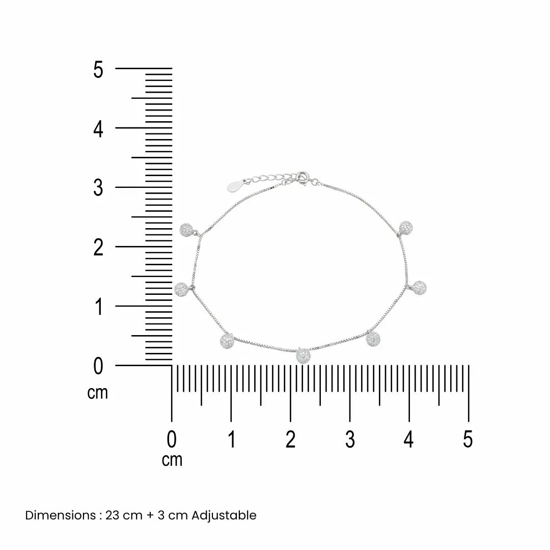 Add a shimmer of elegance to your every step with the Stardust Dangle Silver Anklet — a delicate and enchanting piece designed to captivate. This anklet features a dainty dual-layered chain adorned with sparkling round dangle charms, each one meticulously encrusted with cubic zirconia stones to reflect the light like stars in the night sky. Crafted in high-quality 925 sterling silver, this anklet combines sophistication and durability, making it ideal for everyday wear or special occasions. The adjustable chain ensures a perfect fit, while the lightweight design offers all-day comfort without compromising on glamour.