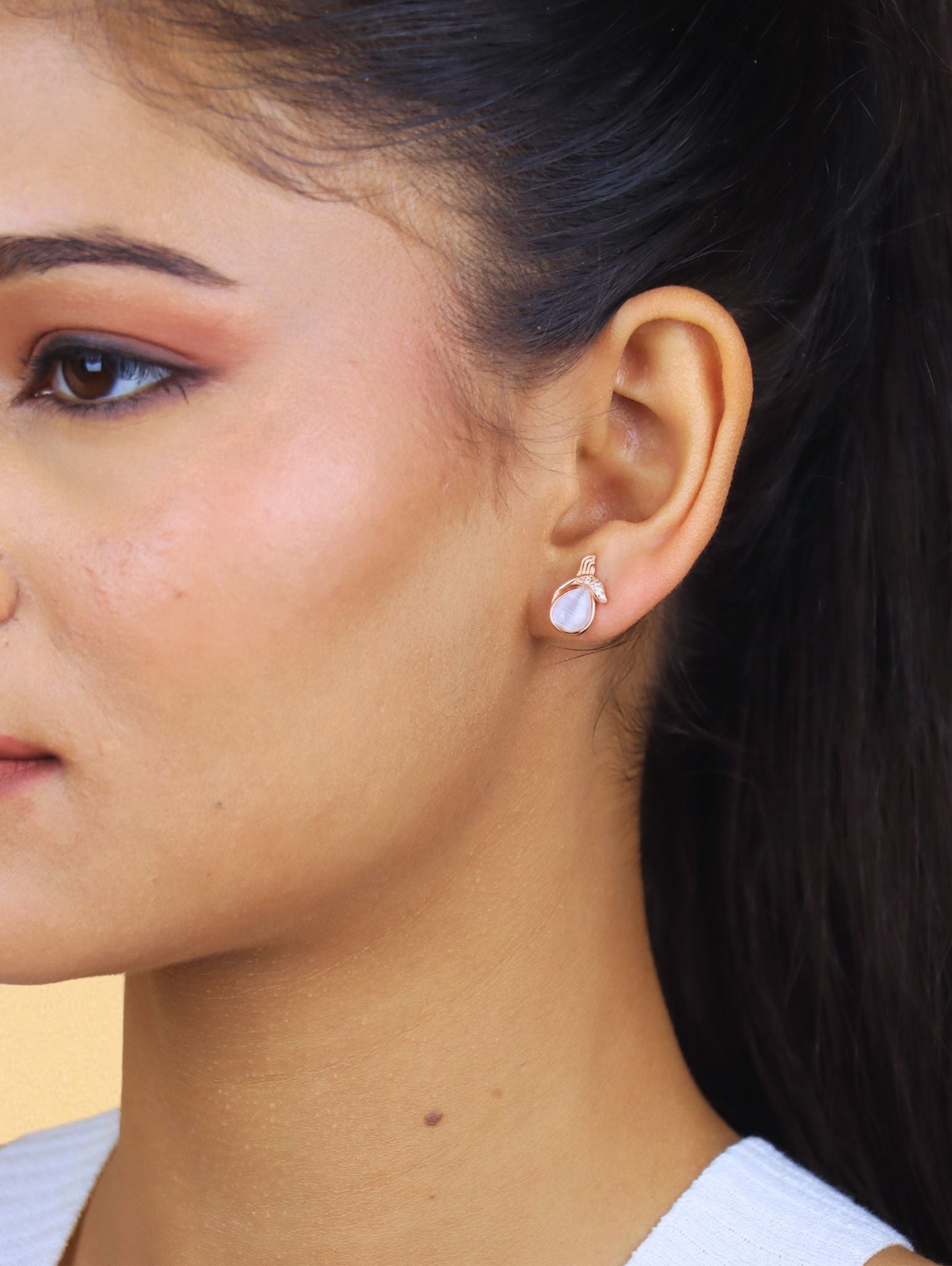 Gracefully encapsulating the essence of nature’s purity, the Ethereal Dewdrop Rose Gold Studs are a stunning testament to refined minimalism and timeless elegance. Each stud features a teardrop-shaped moonstone-look gem, cradled in a warm rose gold setting that flows upward into a delicate leaf-like curve. The upper section is adorned with a cluster of fine, glistening white cubic zirconia stones, mimicking dew-kissed foliage under the morning light.