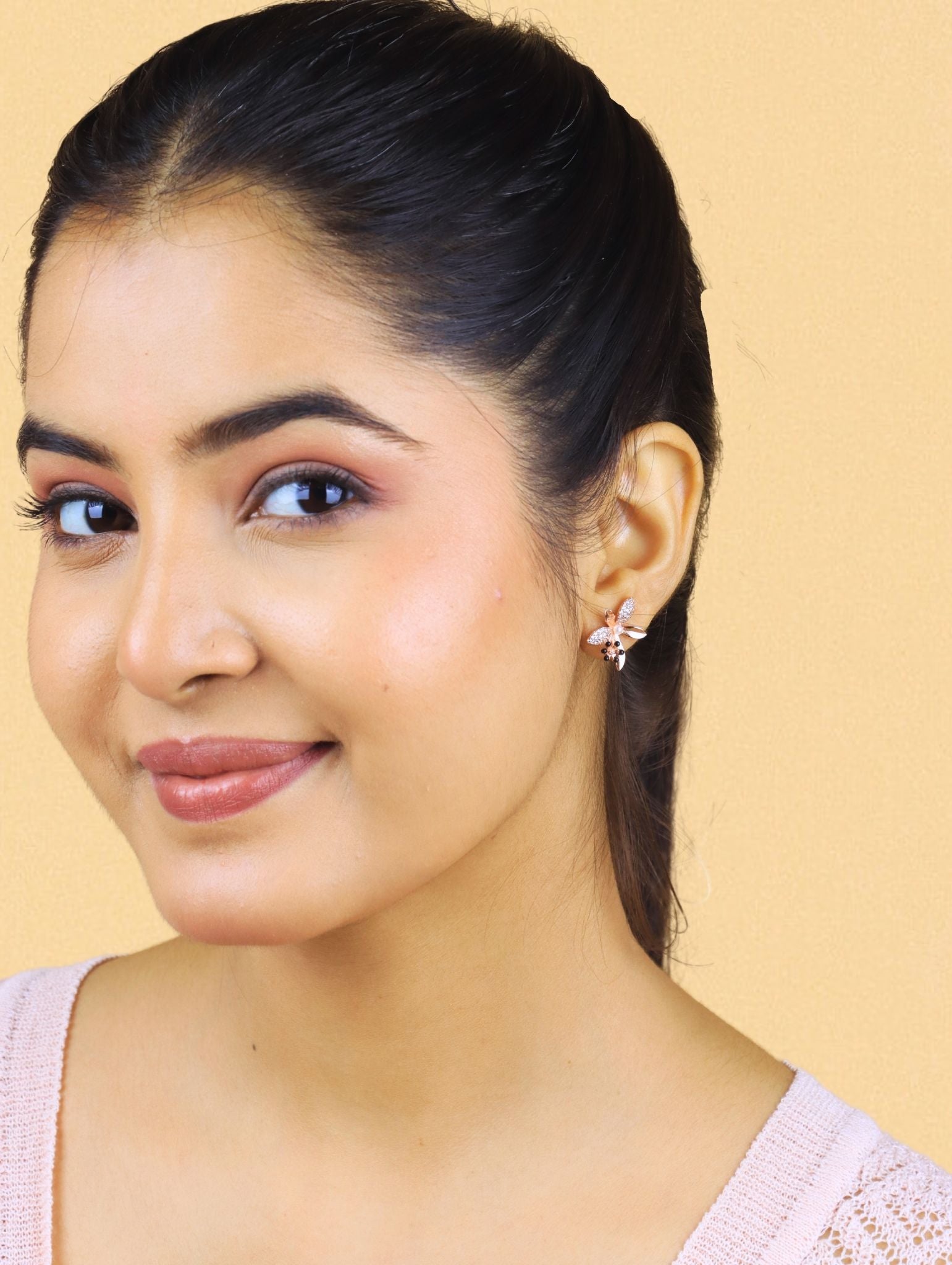 A harmonious blend of floral finesse and modern drama, the Fleur Noire Studs are an ode to botanical beauty with a contemporary edge. Crafted in a rose-gold tone, these earrings bloom with five-petal precision, accentuated by dazzling pave crystals, a central pearl, and striking black beaded stamens. These studs bring a luxurious and artistic flair, ideal for fashion-forward souls who embrace nature and glamour in equal measure.