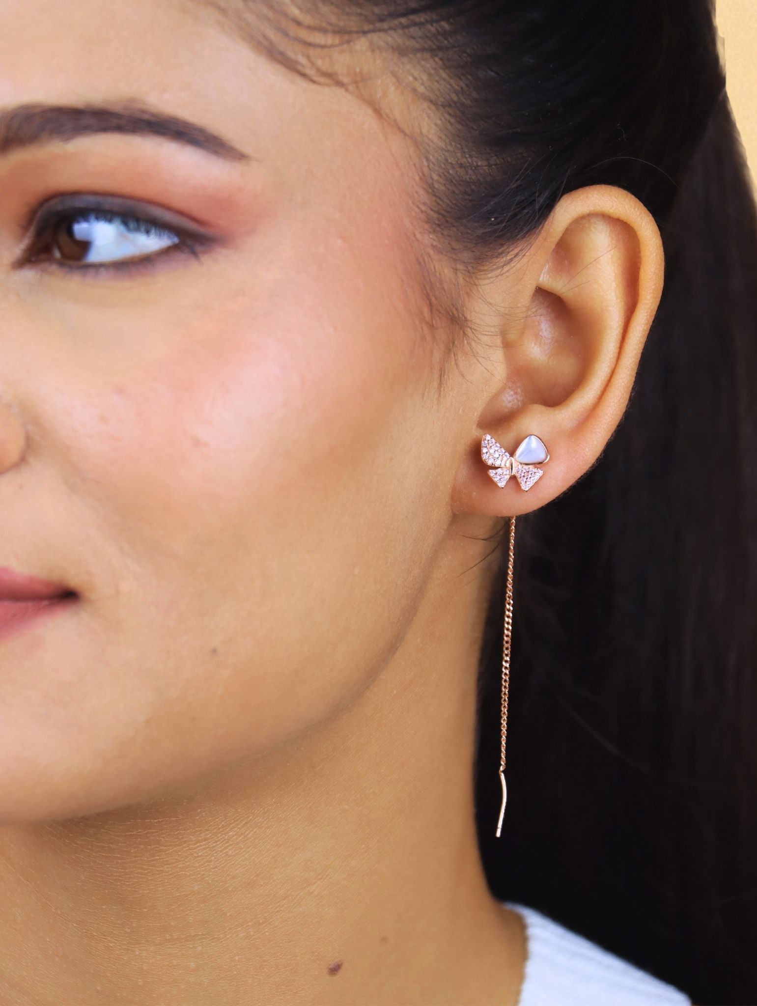 Chic and whimsical, the “Twilight Ribbon” earrings feature a dainty rose gold bow adorned with micro-pavé zirconia and a luminous mother-of-pearl accent. A fine, delicate chain extends from the bow, ending in a tiny looped knot, adding movement and grace to every turn. Lightweight and enchanting, these earrings are perfect for both casual flair and evening elegance.