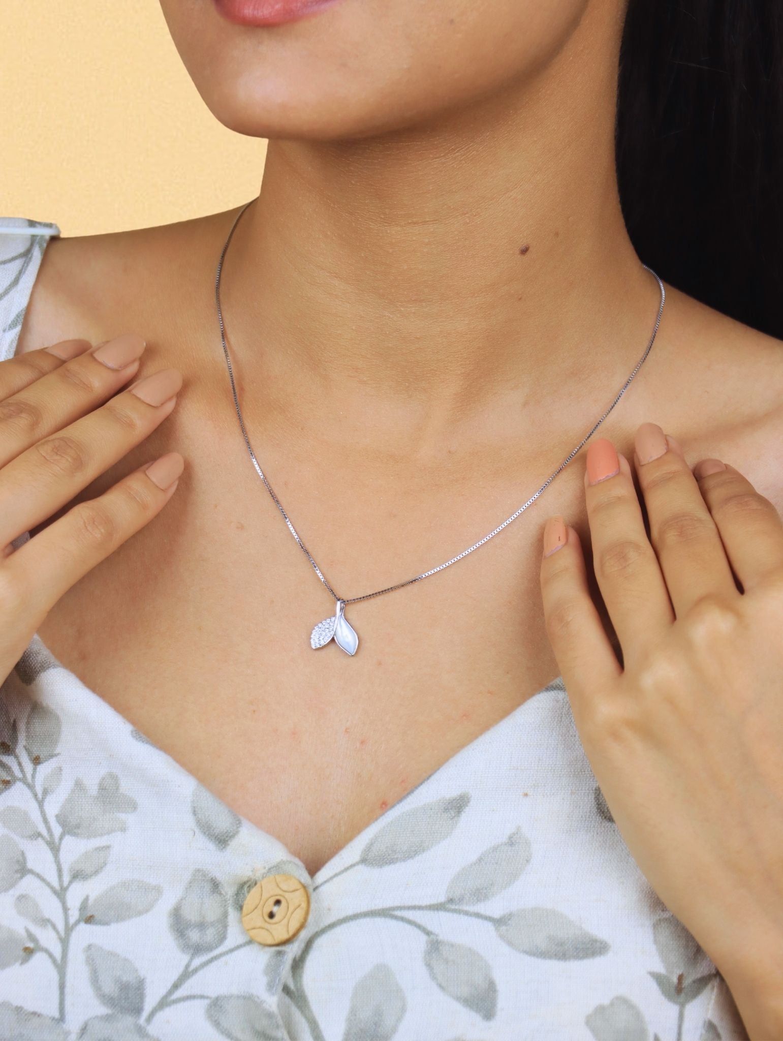Elegant and nature-inspired, the Twilight Leaves Silver Pendant features two overlapping leaf charms, one with cubic zirconia stones, the other with mother-of-pearl. Crafted in high-polish sterling silver, it offers a balance of sparkle and organic charm. The delicate box chain makes it perfect for layering or wearing solo. A symbol of growth and renewal, it’s an ideal gift or everyday statement piece.